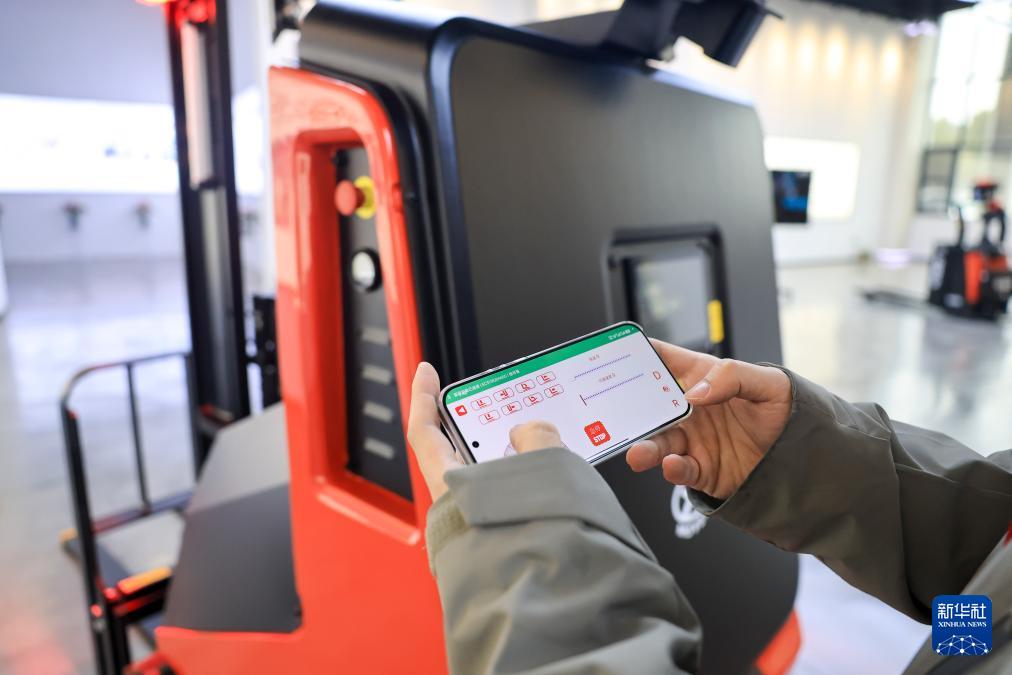 3月16日,在江蘇江陰—靖江工業(yè)園區(qū)江蘇中力叉車有限公司展廳內(nèi),技術(shù)人員在演示掏箱機器人。
