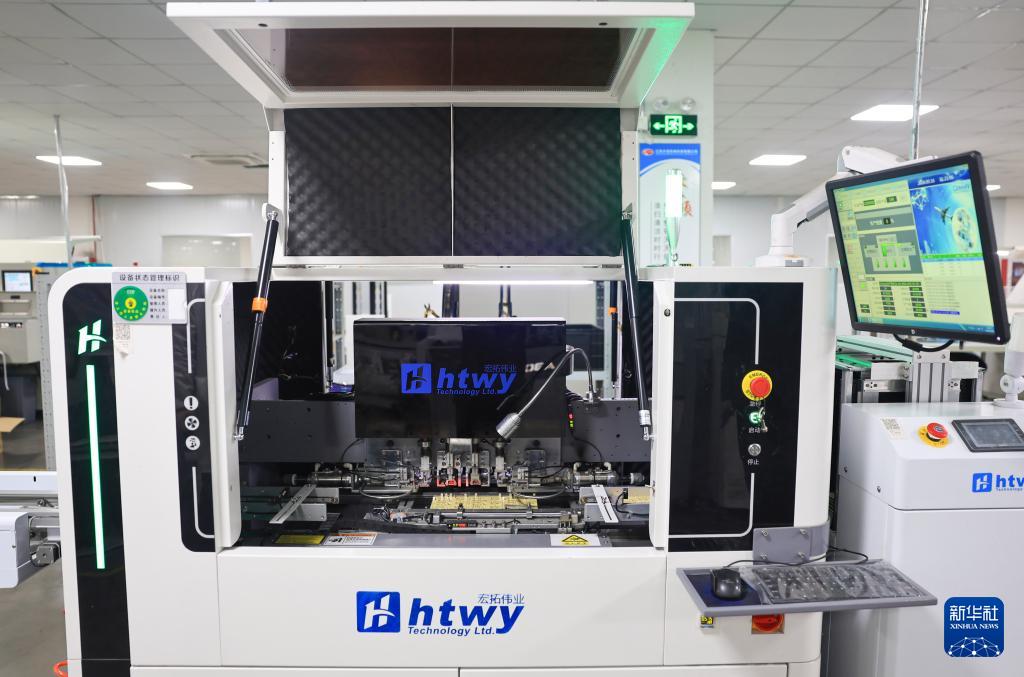 3月16日,在江蘇省靖江市西來鎮(zhèn)的江蘇沙龍機電科技有限公司電子制造生產(chǎn)車間內(nèi),貼片機進(jìn)行電子元件貼裝作業(yè)。