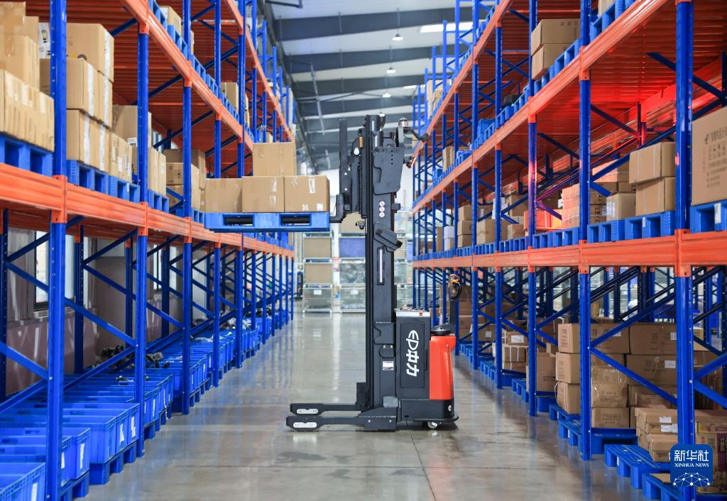 3月16日,在江蘇江陰—靖江工業(yè)園區(qū)江蘇中力叉車有限公司倉儲區(qū),智能堆高式機器人對貨物進(jìn)行堆垛。