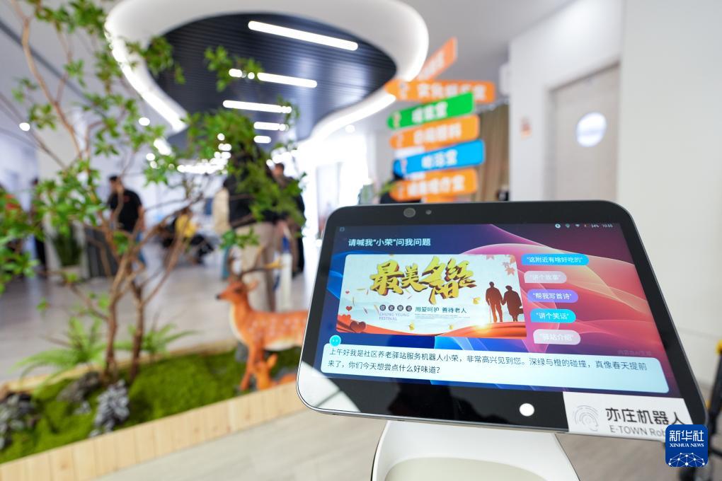 在智慧康養(yǎng)機(jī)器人養(yǎng)老驛站內(nèi),引導(dǎo)機(jī)器人在歡迎前來的居民(3月18日攝)。