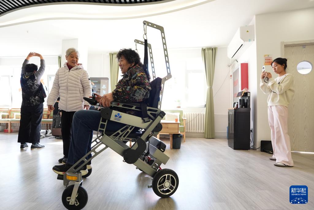 在智慧康養(yǎng)機(jī)器人養(yǎng)老驛站內(nèi),一名社區(qū)居民(前)體驗(yàn)一款智能行走機(jī)器人(3月18日攝)。