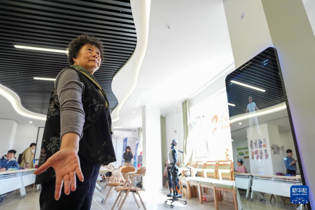 在智慧康養(yǎng)機(jī)器人養(yǎng)老驛站內(nèi),一名社區(qū)居民跟隨一款智能設(shè)備練習(xí)八段錦(3月18日攝)。