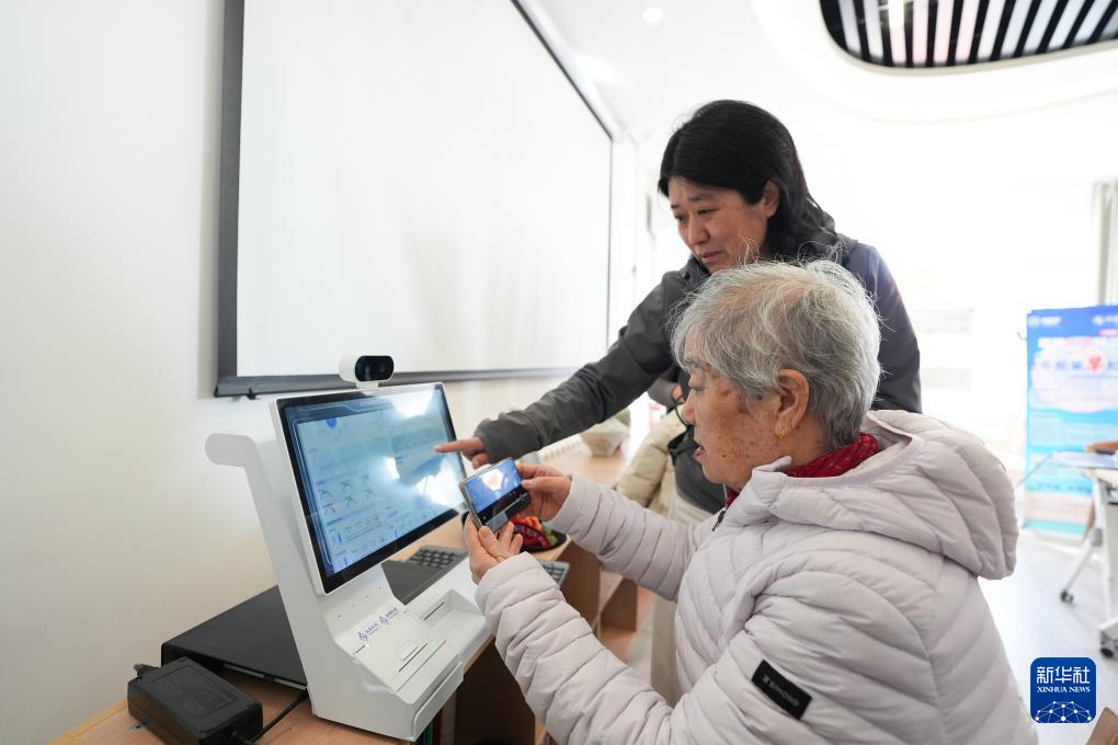 一名社區(qū)居民(前)在智慧康養(yǎng)機(jī)器人養(yǎng)老驛站內(nèi)體驗(yàn)一款智慧健康設(shè)備(3月18日攝)。