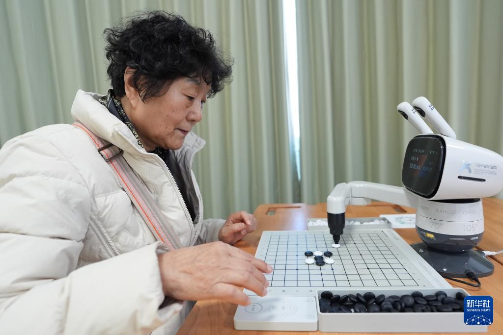 在智慧康養(yǎng)機(jī)器人養(yǎng)老驛站內(nèi),一名社區(qū)居民與一款機(jī)器人下五子棋(3月18日攝)。