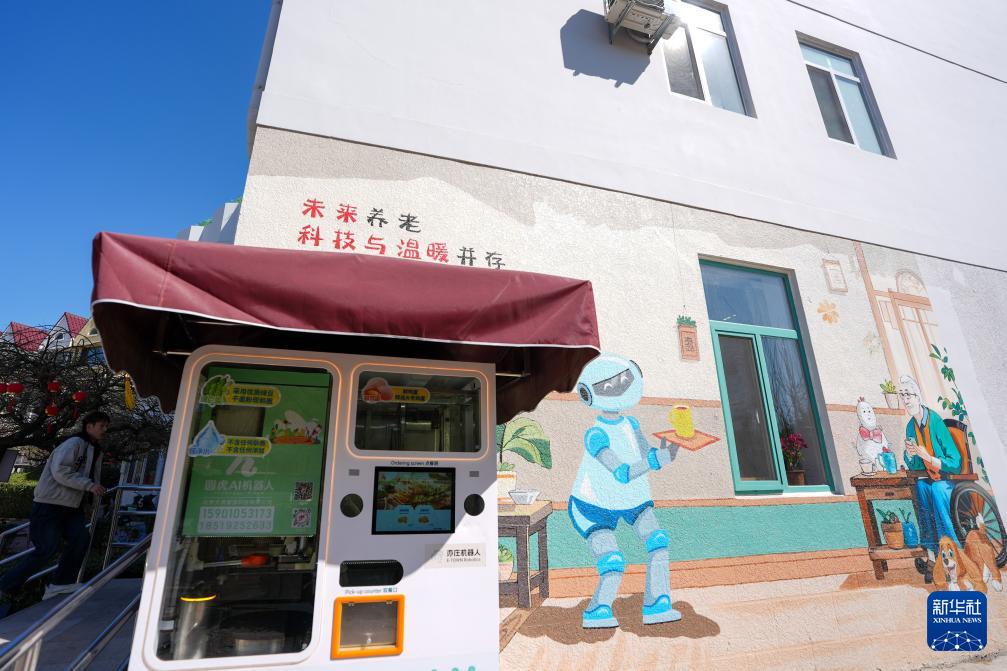 北京榮華街道智慧康養(yǎng)機(jī)器人養(yǎng)老驛站外擺放著可以外賣煎餅的“圓虎煎餅機(jī)器人”(3月18日攝)。