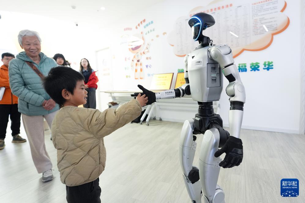 在智慧康養(yǎng)機(jī)器人養(yǎng)老驛站內(nèi),小朋友與一款人形機(jī)器人握手(3月18日攝)。