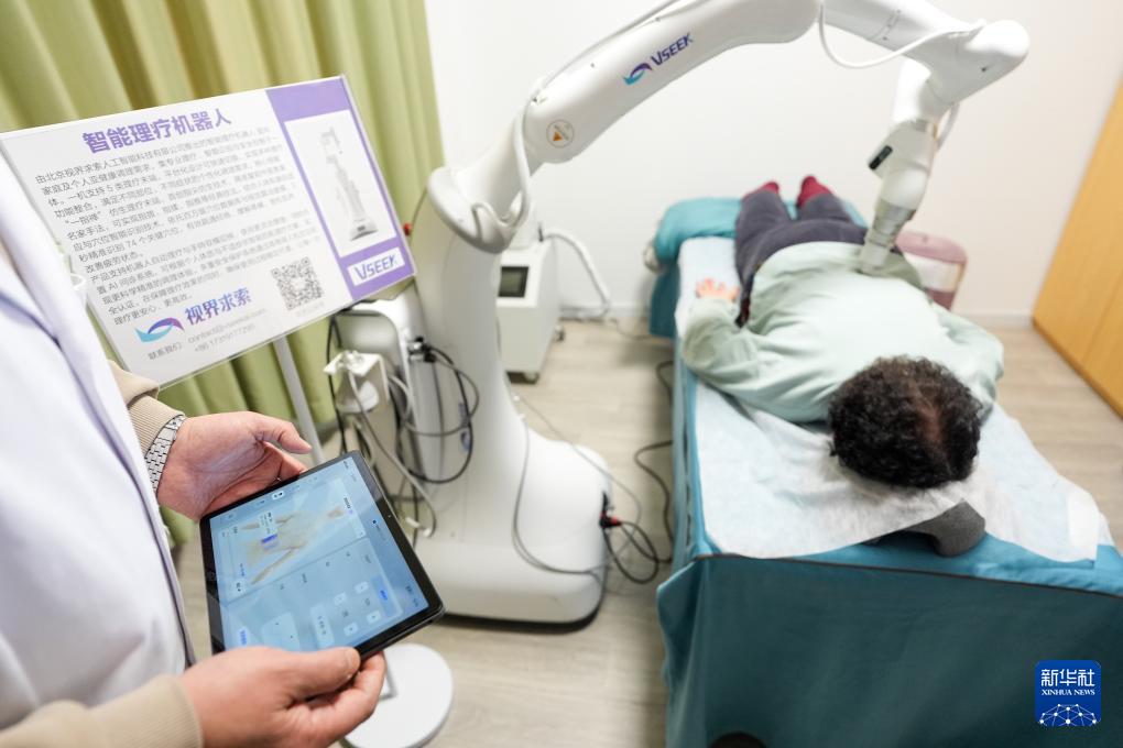 在智慧康養(yǎng)機(jī)器人養(yǎng)老驛站內(nèi),一名社區(qū)居民體驗(yàn)一款智能理療機(jī)器人(3月18日攝)。