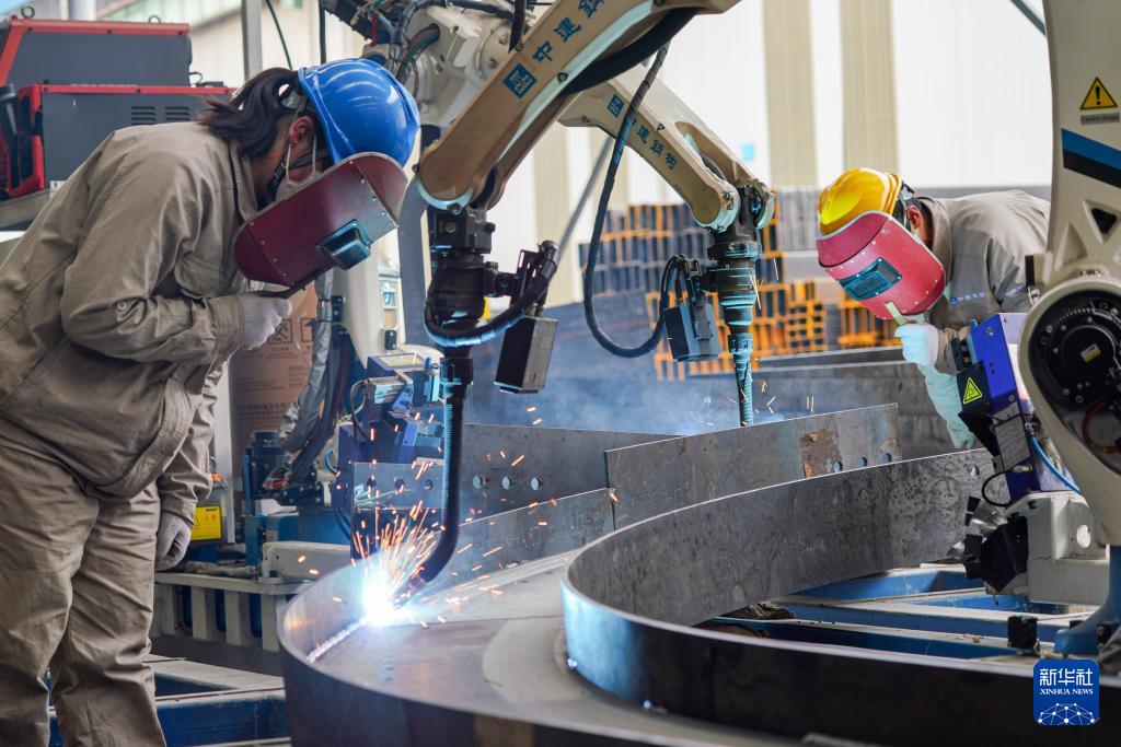 在四川眉山天府新區(qū)中建鋼構(gòu)四川有限公司加工車間里,機(jī)器人操作員在觀察機(jī)器人焊接鋼構(gòu)產(chǎn)品的焊接點(diǎn)(2026年3月23日攝)。新華社發(fā)(翁光建攝)