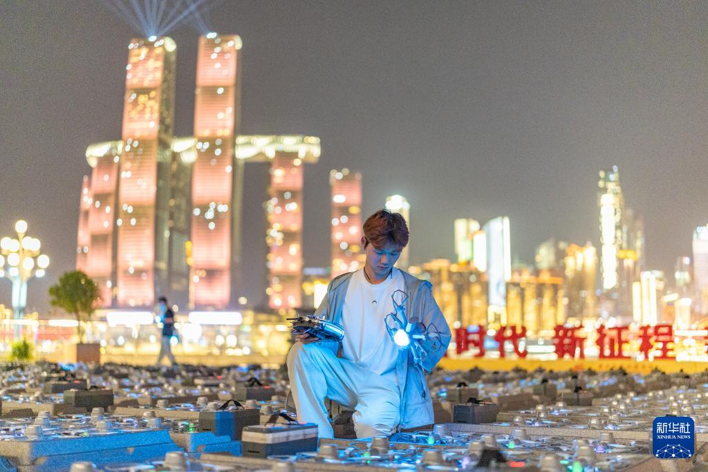 在重慶市南岸區(qū),無人機(jī)群飛行規(guī)劃員陸子祥在檢查即將執(zhí)行飛行表演的無人機(jī)狀態(tài)(2025年5月1日攝)。新華社記者 黃偉 攝