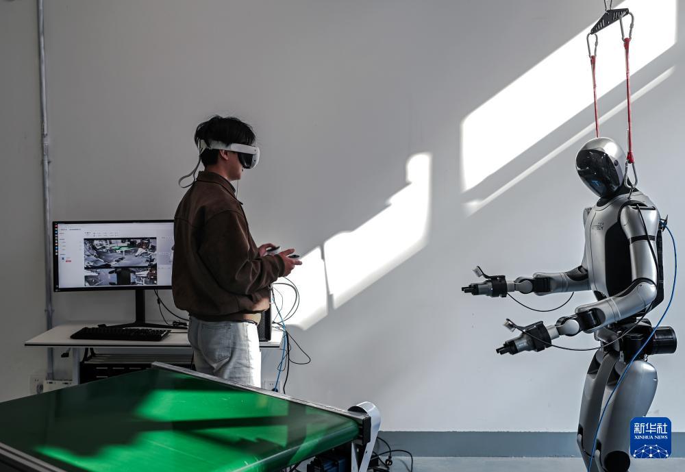 在四川人形機(jī)器人多模態(tài)數(shù)據(jù)采集測試中心,數(shù)據(jù)采集員在調(diào)試機(jī)器人(2026年2月24日攝)。新華社發(fā)(何海洋攝)