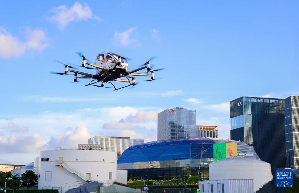在2025國際低空經(jīng)濟(jì)博覽會期間,億航智能的無人駕駛載人eVTOL(電動垂直起降飛行器)在上海飛行(2025年7月23日攝)。新華社發(fā)