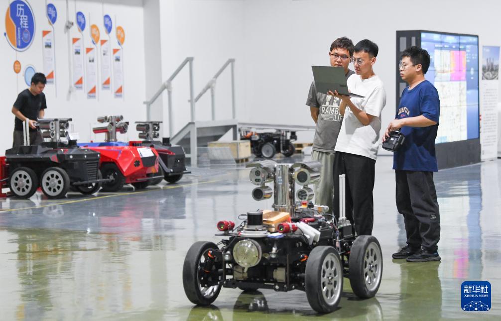在位于重慶兩江新區(qū)的七騰機(jī)器人有限公司重慶工廠,技術(shù)人員在調(diào)試防爆輪式機(jī)器人(2025年5月27日攝)。新華社記者 王全超 攝