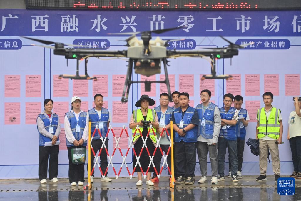 在粵桂協(xié)作·廣西融水興苗零工市場,工作人員在進(jìn)行植保無人機(jī)培訓(xùn)(2025年5月15日攝)。新華社記者 黃孝邦 攝