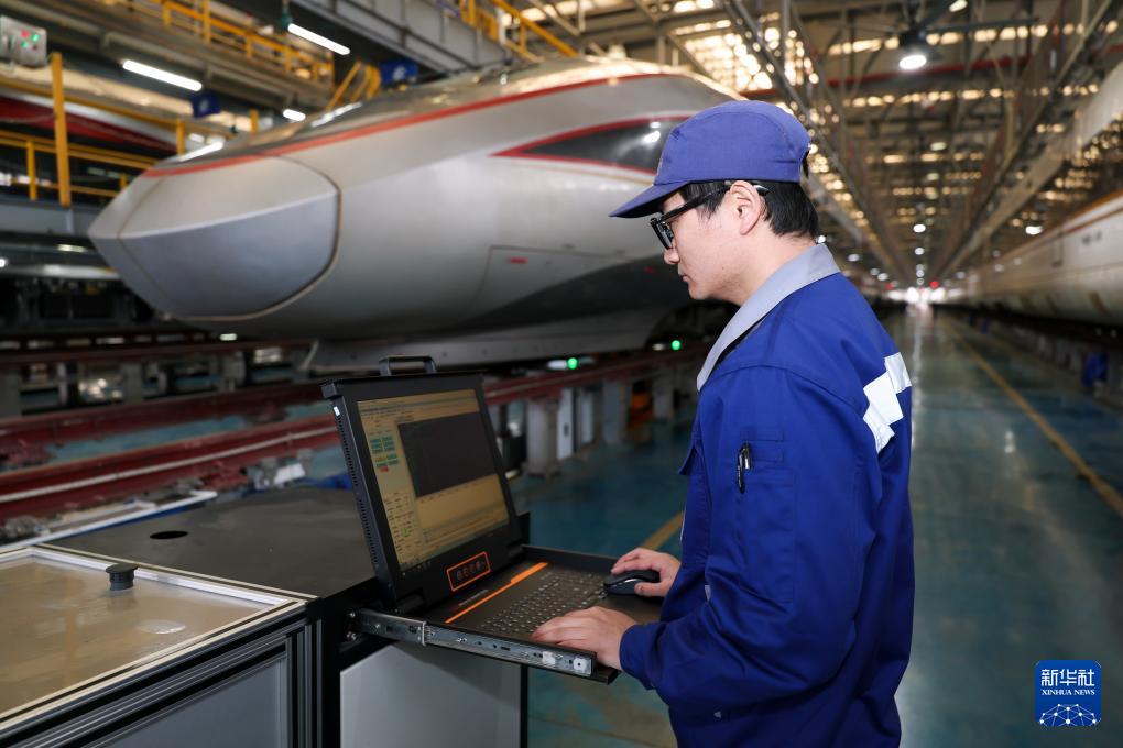 在上海動車段虹橋動車運(yùn)用所,地勤機(jī)械師運(yùn)用智能化輪輞輪輻超聲波探傷機(jī)對動車組車輪進(jìn)行超聲波探傷(2026年2月28日)。新華社記者 王翔 攝