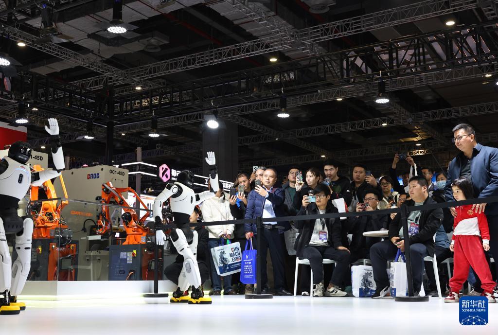 3月23日,參觀者在展會現(xiàn)場觀看人形機(jī)器人舞蹈表演。