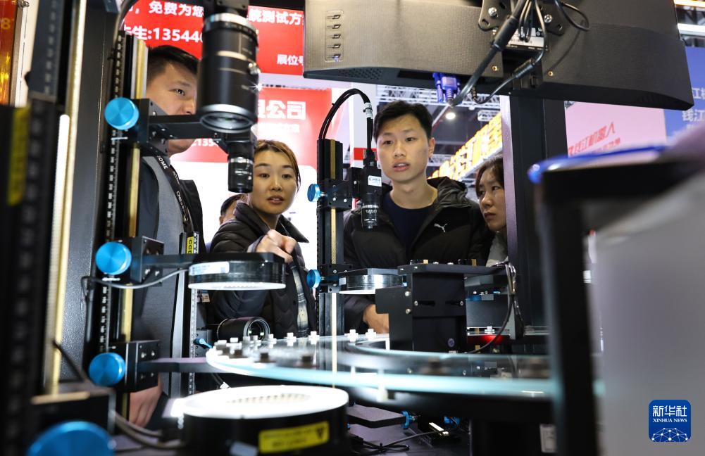 3月23日,參觀者在一臺光學(xué)影像自動化檢測設(shè)備前駐足觀看。