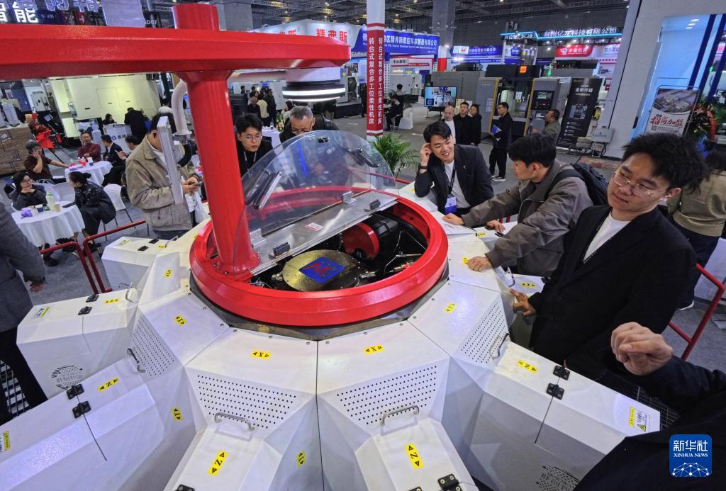 3月23日,參觀者在一款轉(zhuǎn)臺式多工位柔性復(fù)合機(jī)床展品旁觀看交流。