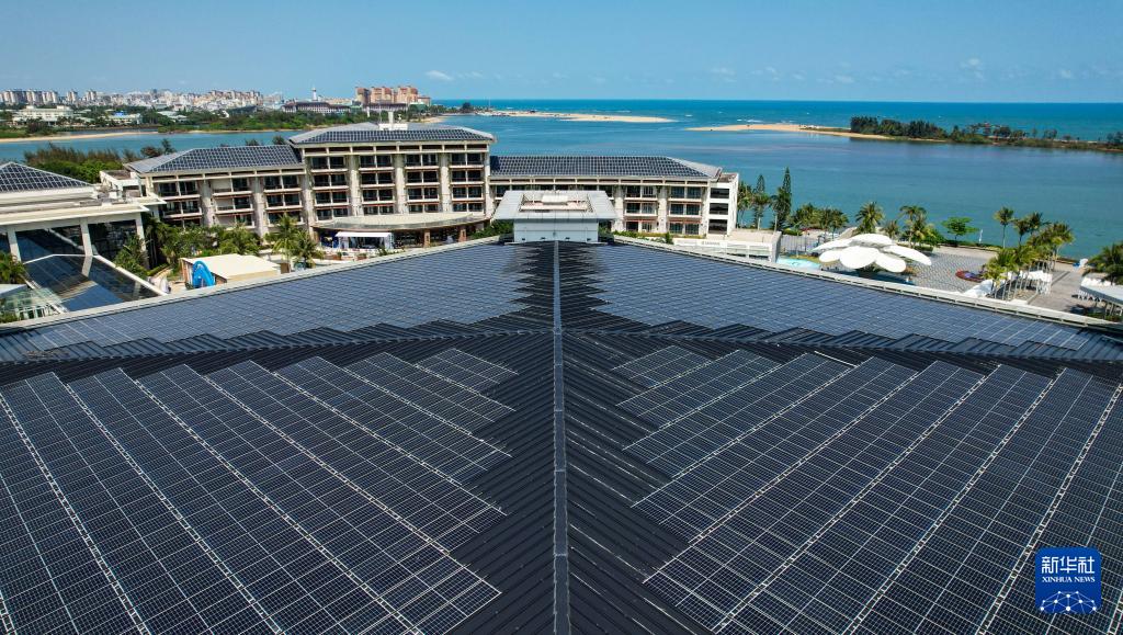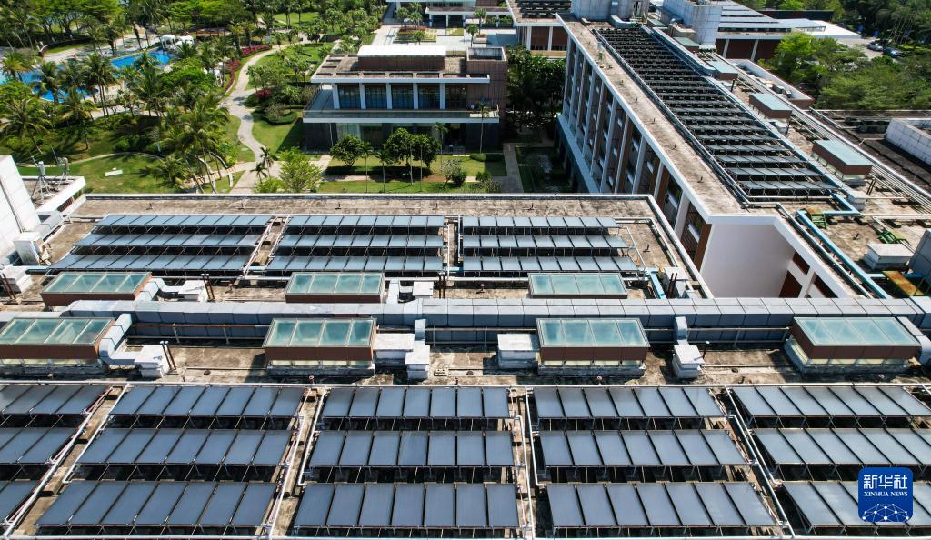 在博鰲零碳示范區(qū)拍攝的東嶼島大酒店屋頂?shù)墓夥O(shè)備(3月19日攝,無人機照片)。