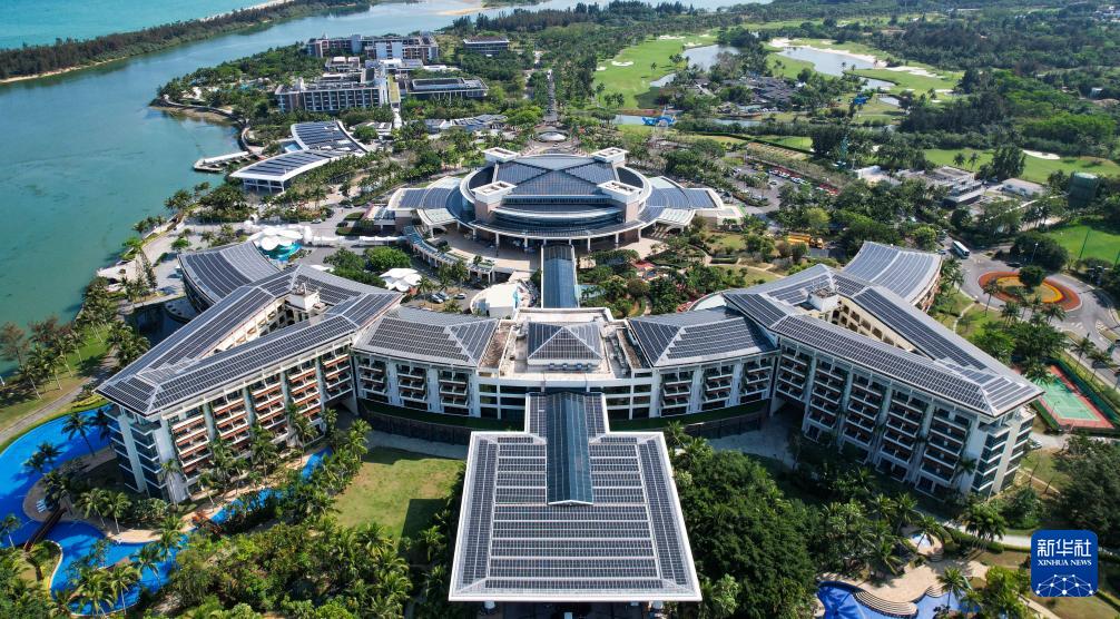 在博鰲零碳示范區(qū)拍攝的博鰲亞洲論壇國際會議中心和博鰲亞洲論壇大酒店屋頂?shù)墓夥O(shè)備(3月19日攝,無人機照片)。