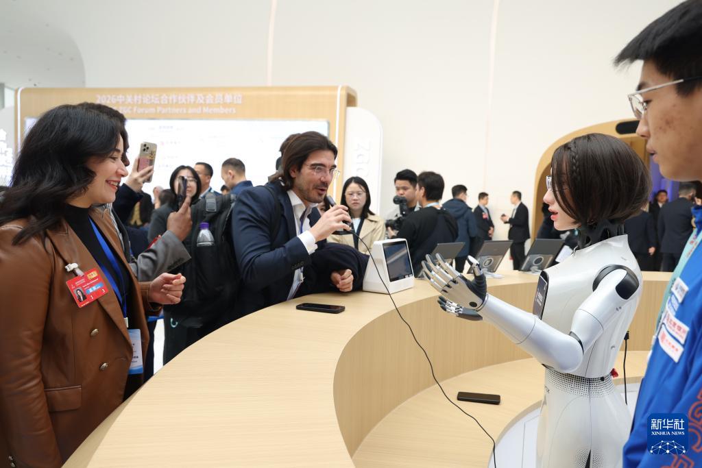 3月25日,在中關(guān)村國際創(chuàng)新中心,嘉賓與迎賓機(jī)器人“小諾”互動(dòng)。