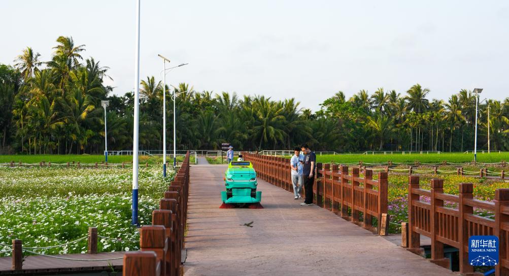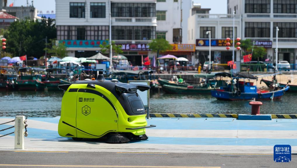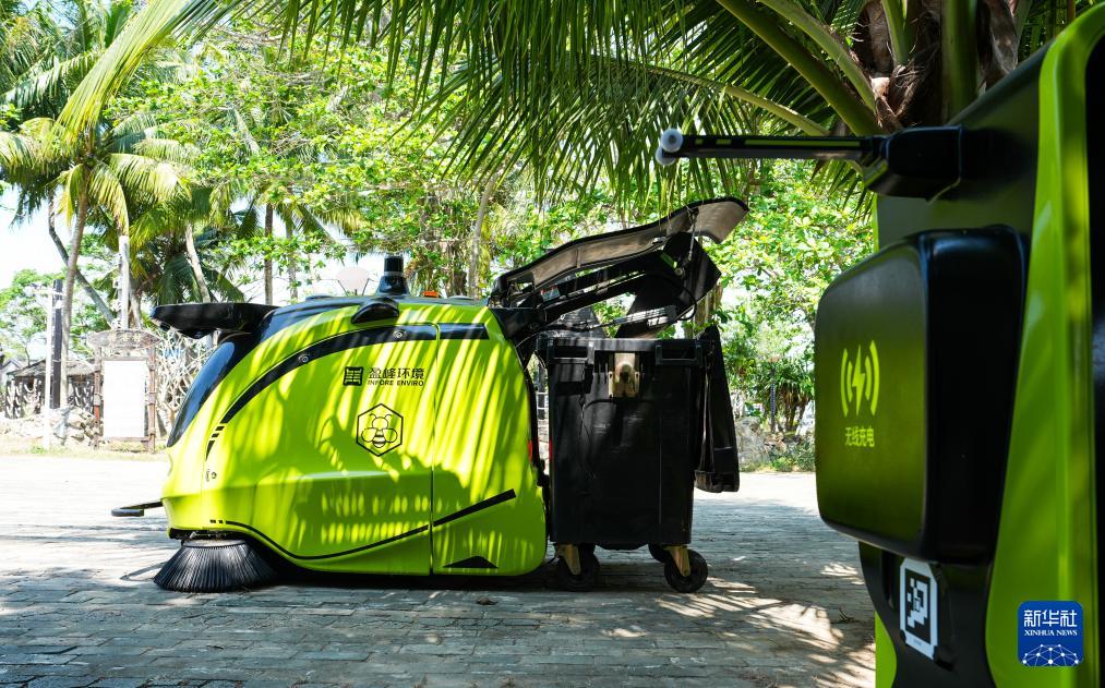 小蜜蜂智慧清潔機器人在海南省瓊海市潭門鎮(zhèn)排港村作業(yè)(3月25日攝)。