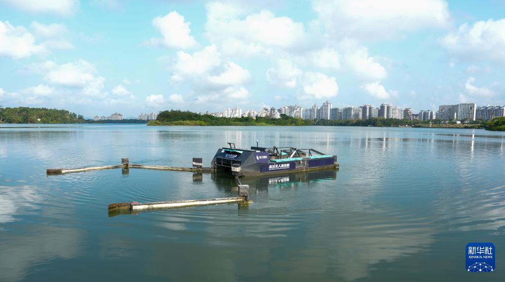 水上智慧環(huán)衛(wèi)無人清潔船在萬泉河水面作業(yè)(3月25日攝)。