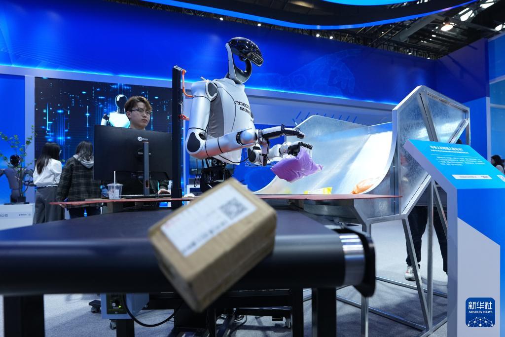 在中關(guān)村展示中心常設(shè)展上,一臺(tái)半身人形機(jī)器人在進(jìn)行包裹分揀展示(3月25日攝)。