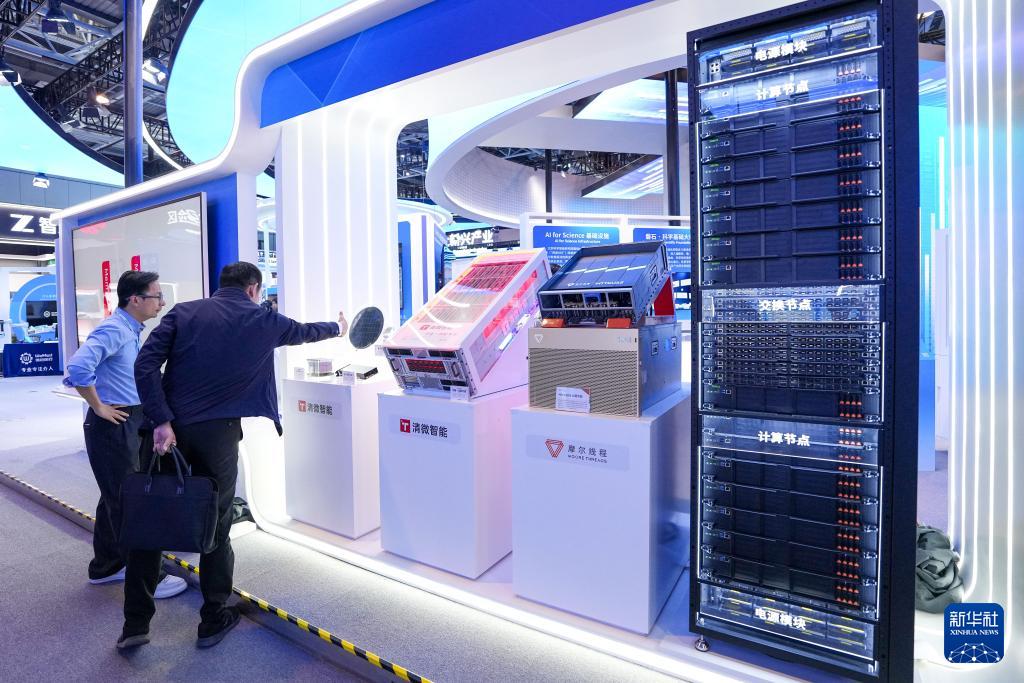 在中關(guān)村展示中心常設(shè)展上,參觀者在“人工智能+”展區(qū)了解展出的AI芯片和服務(wù)器(3月25日攝)。