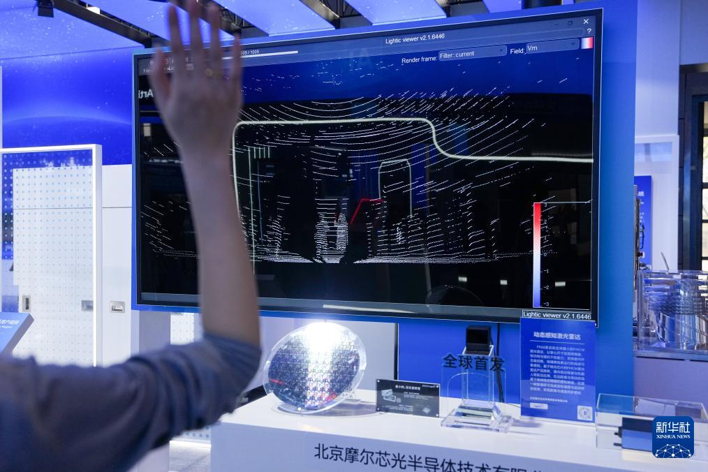 在中關(guān)村展示中心常設(shè)展上,一位工作人員在演示一款可用于自動(dòng)駕駛與機(jī)器人的動(dòng)態(tài)感知激光雷達(dá)(3月25日攝)。