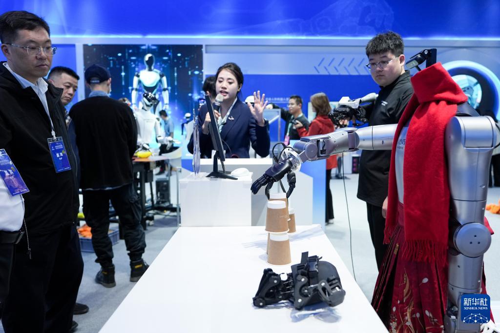 在中關(guān)村展示中心常設(shè)展上,一臺(tái)配備了靈巧手的機(jī)器人在展示穿針引線(3月25日攝)。