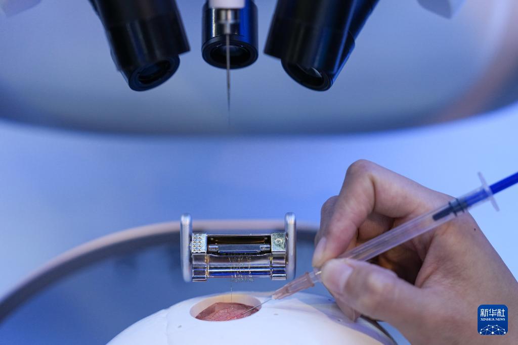 在中關(guān)村展示中心常設(shè)展上,工作人員在展示一款高通量柔性電極植入機(jī)器人植入的電極絲(3月25日攝)。
