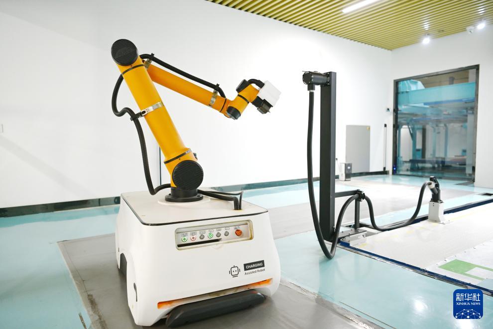 這是雄安新區(qū)劇村變電站智慧充電區(qū)的電動(dòng)汽車充電機(jī)器人(3月25日攝)。