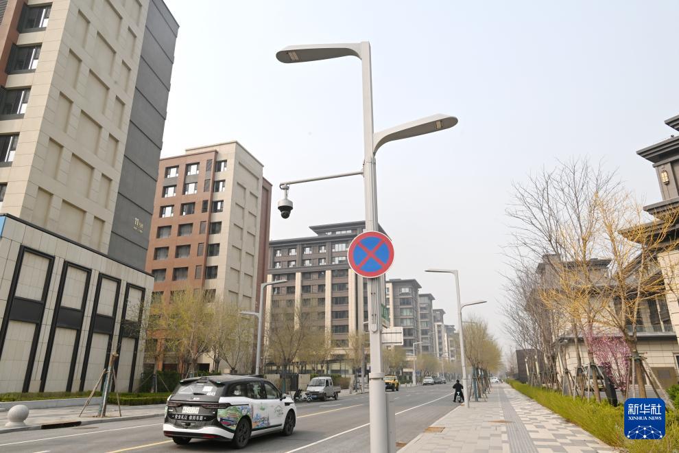雄安新區(qū)容東片區(qū)內(nèi)的智慧燈桿(3月26日攝)。智慧燈桿搭載著各類傳感器,實(shí)時(shí)捕捉交通流量,再通過算法自動(dòng)調(diào)整紅綠燈配時(shí),打造“智能彈性綠波帶”。