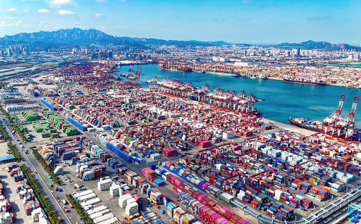 貨輪在青島自貿(mào)片區(qū)裝卸貨物(2025年11月5日攝,無(wú)人機(jī)照片)。新華社發(fā)(張進(jìn)剛 攝)