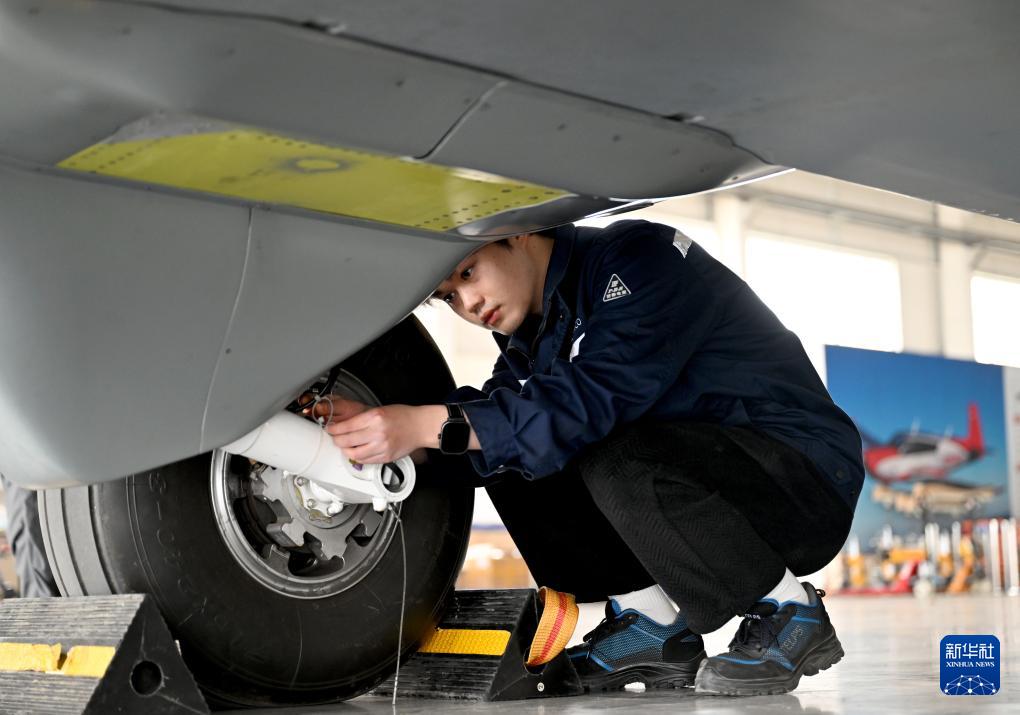 3月30日,在河南鄭州上街機(jī)場,工作人員在試飛前檢查運(yùn)投無人機(jī)長鷹-8輪胎。