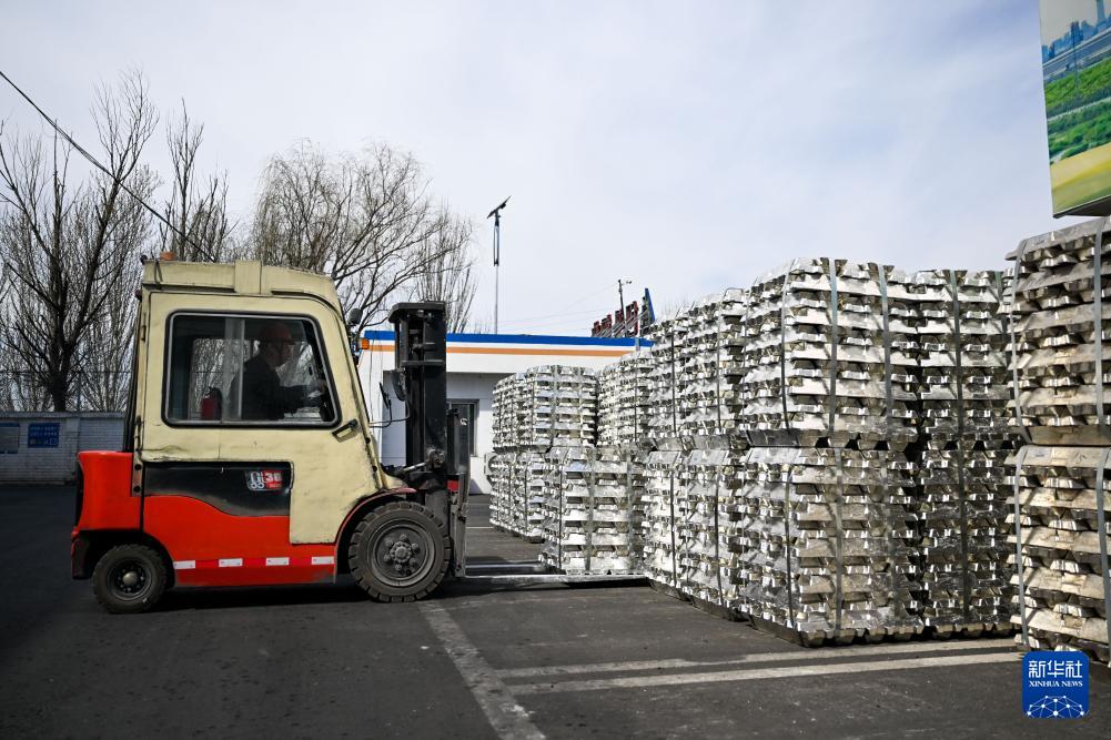 4月1日,工人在包頭鋁業(yè)有限公司駕駛叉車搬運鋁錠。
