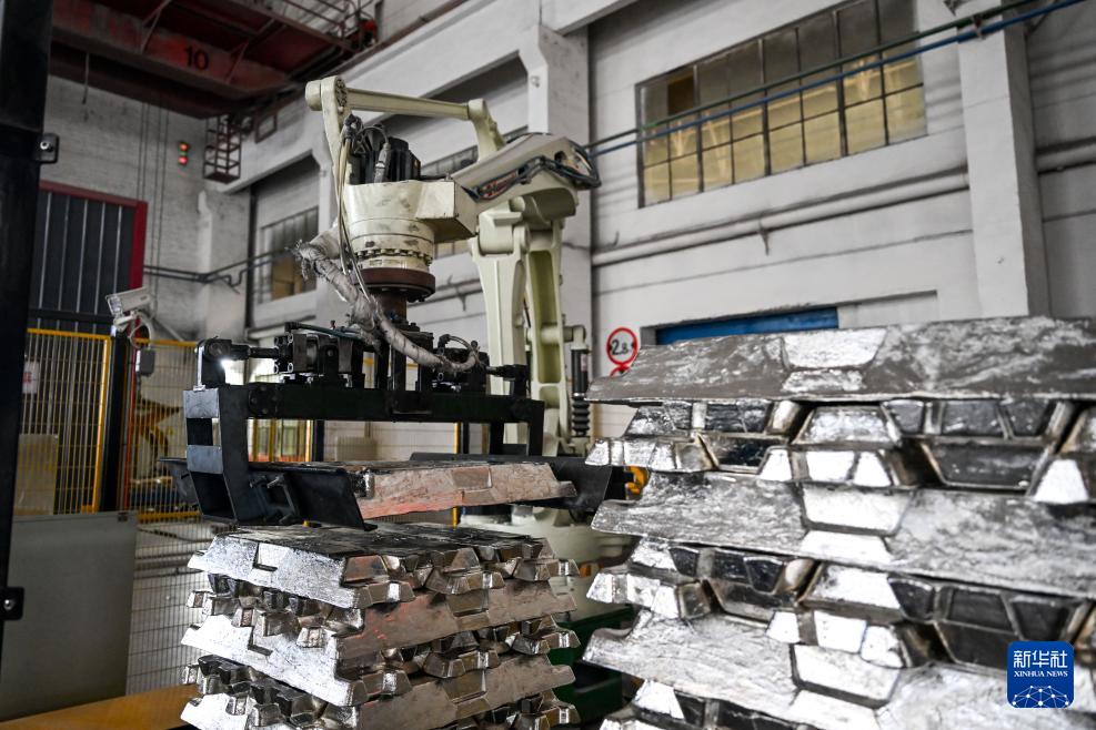 4月1日,機械臂在包頭鋁業(yè)有限公司鑄鋁生產(chǎn)線上搬運鋁錠。