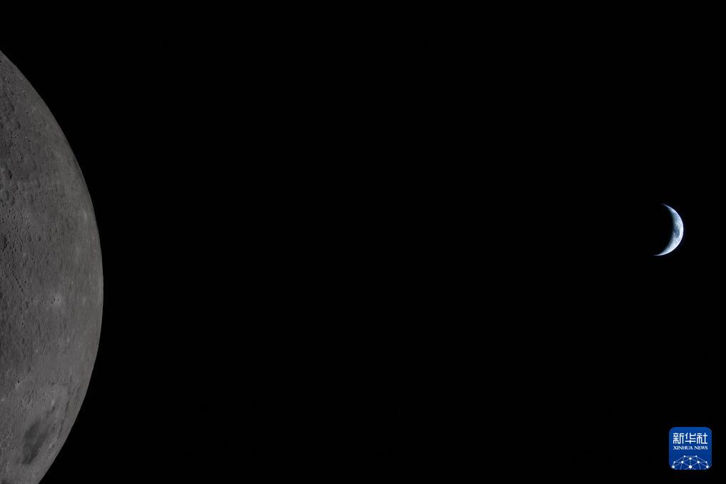 這是4月6日從執(zhí)行“阿耳忒彌斯2號(hào)”載人繞月飛行任務(wù)的“獵戶座”飛船上拍攝的月球(前)和地球。