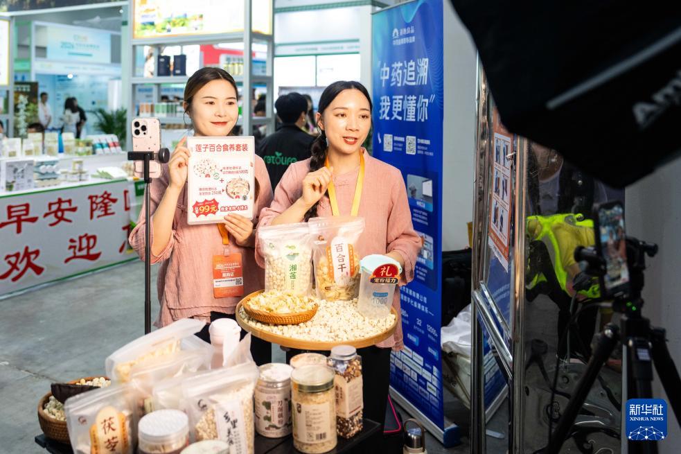 4月10日,在湖南國際會展中心,參展商通過直播推銷食療養(yǎng)生產品。