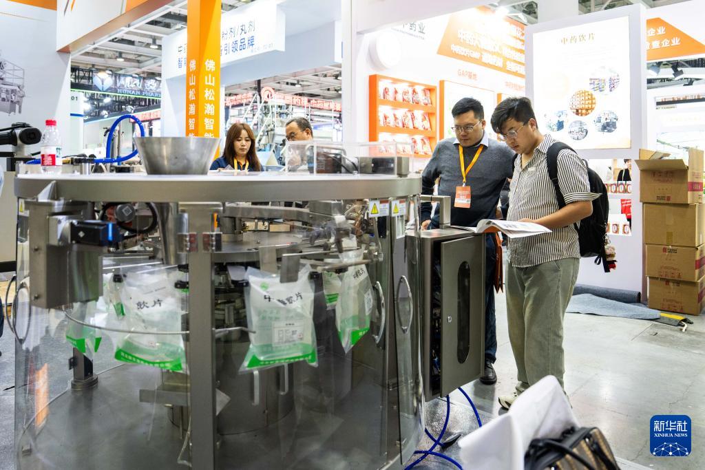 4月10日,在湖南國際會展中心,觀眾(右一)在了解一款自動化藥品包裝設備。