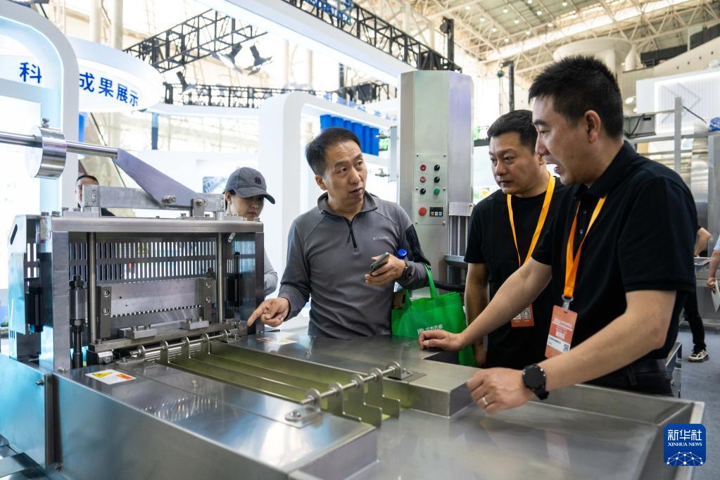4月10日,在湖南國際會展中心,觀眾(右三)在了解一款中藥材自動切片機。