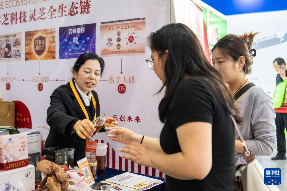4月10日,在湖南國際會展中心,參展商(左)為觀眾介紹靈芝飲品。