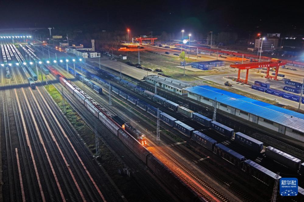 4月10日,在濟(jì)鐵煙臺(tái)物流園,鐵路集裝箱班列在進(jìn)行裝車作業(yè)(無(wú)人機(jī)照片)。
