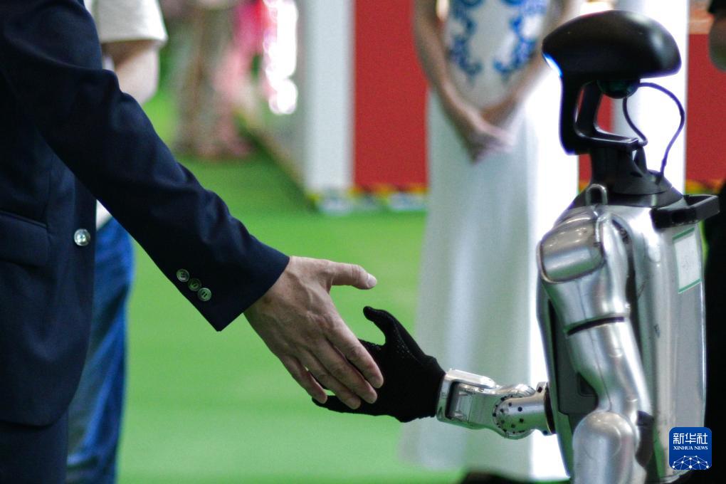 4月13日,一名男子在第六屆消博會上與一款人形機器人握手。