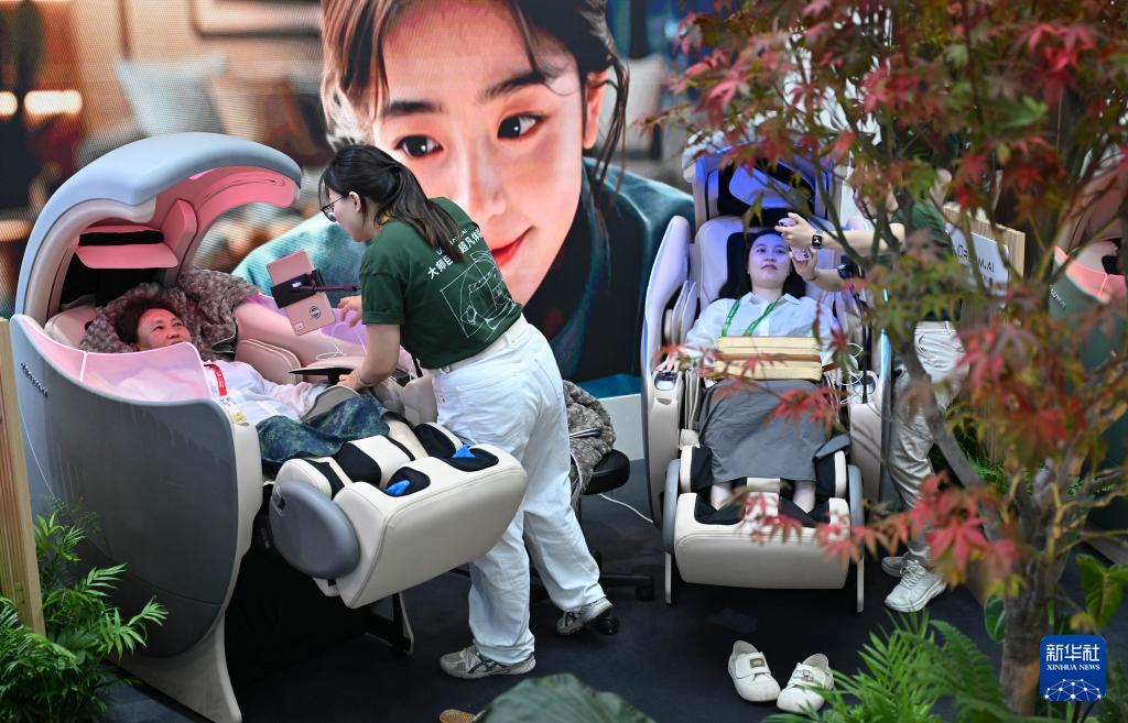 4月13日,參觀者在第六屆消博會現(xiàn)場體驗按摩椅。