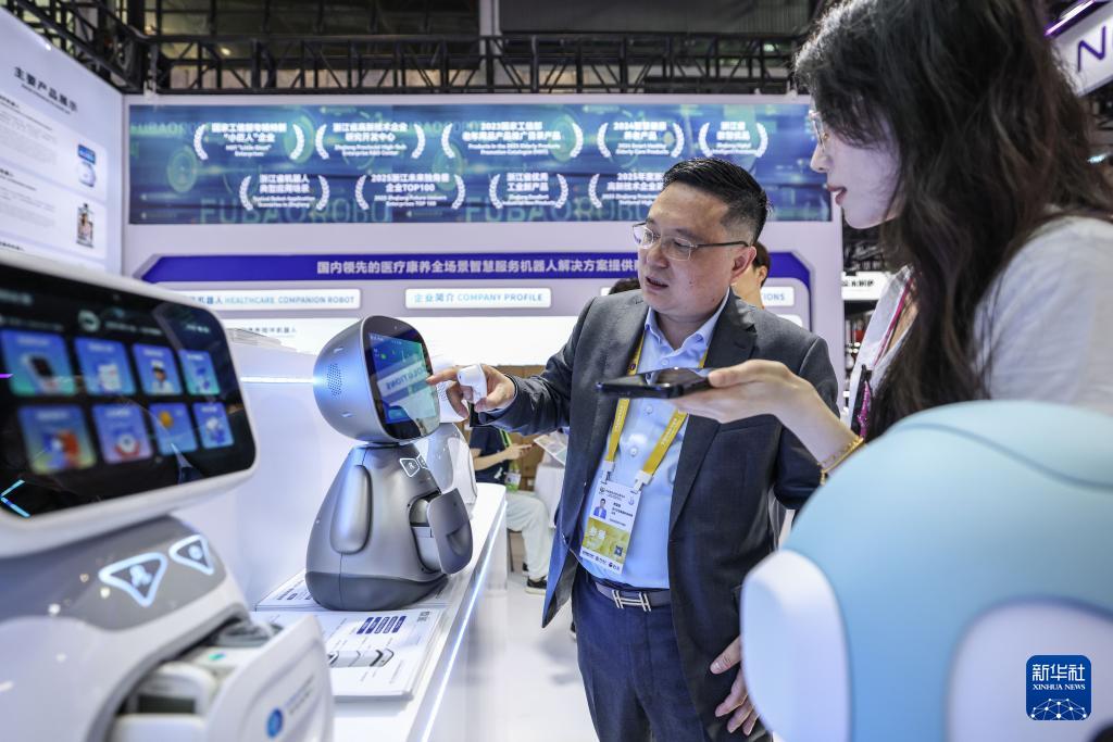4月13日,參觀者在第六屆消博會現(xiàn)場了解一款康養(yǎng)陪伴機器人。