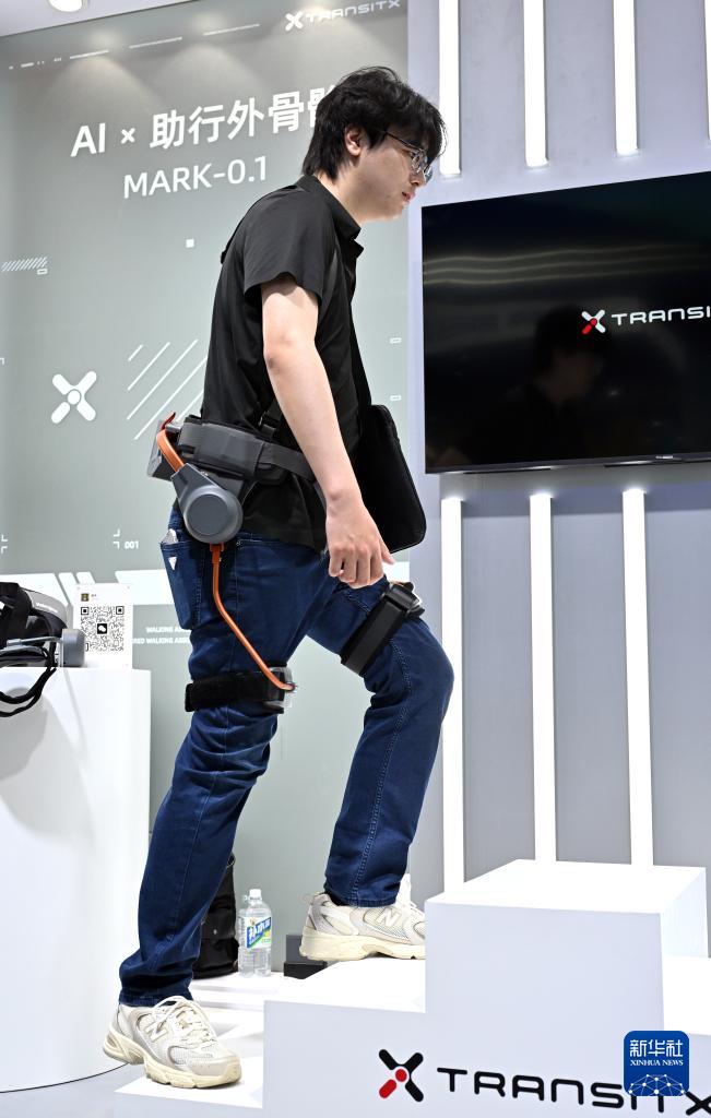 4月14日,參觀者在第六屆消博會現(xiàn)場體驗(yàn)一款A(yù)I助行外骨骼。