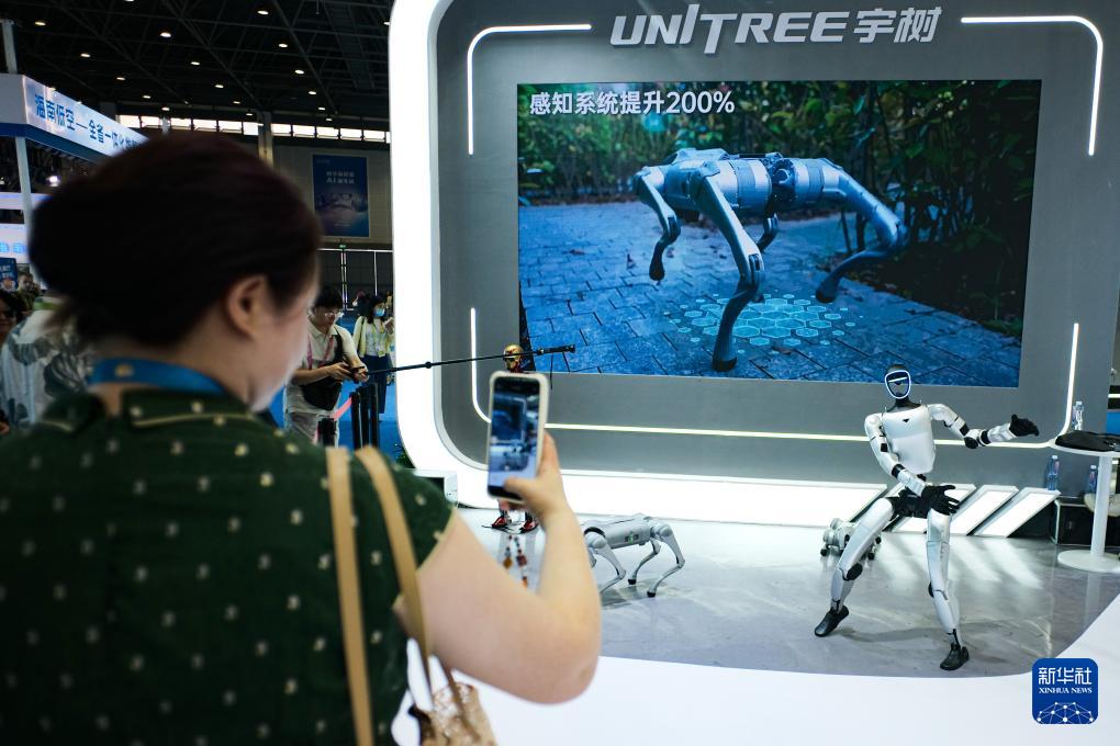 4月14日,觀眾在第六屆消博會展廳內(nèi)拍攝跳舞表演的宇樹機(jī)器人。