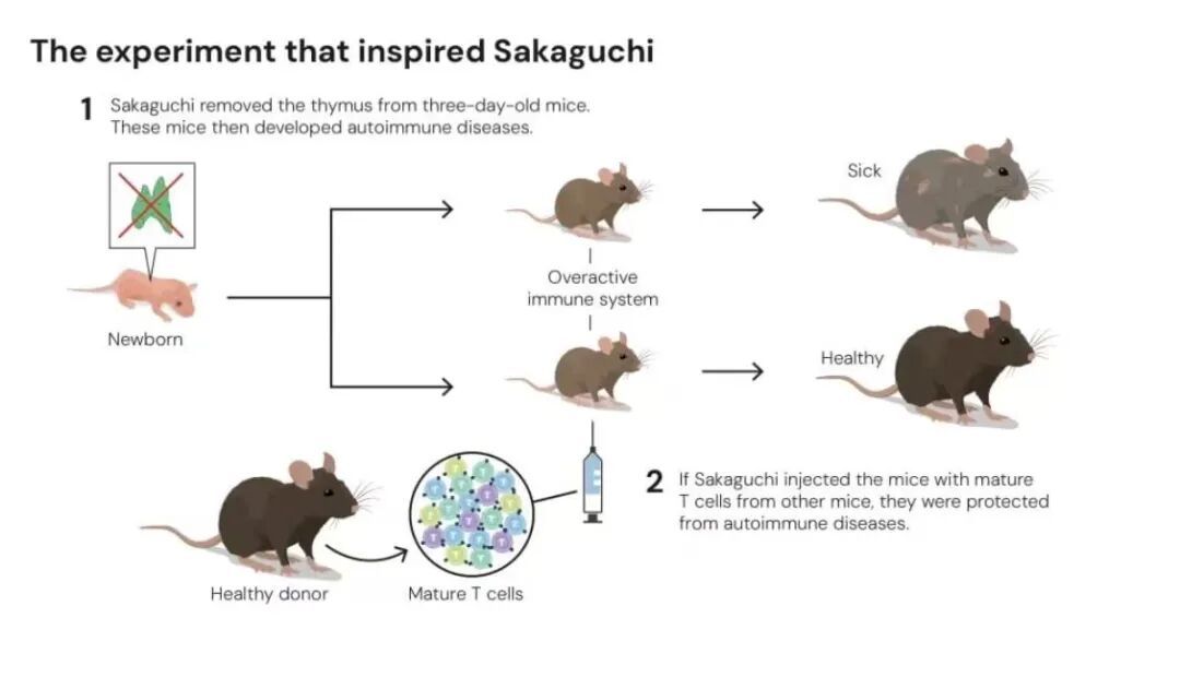 日本名古屋的愛知縣癌癥中心研究所的坂口志文于1995年在《免疫學雜志》上首先發(fā)表研究結果,宣稱發(fā)現(xiàn)了一類全新的T細胞,其特征在于其表面攜帶CD4受體,同時還攜帶一種稱為CD25的受體(蛋白質)。坂口志文設計了一個對小鼠的精巧的實驗,證明小鼠的表面帶有CD4和CD25兩種蛋白的T細胞是控制自身免疫反應的“開關”。把健康小鼠體內的這些細胞移除后,小鼠患上了嚴重的自身免疫病;反之,把這些細胞輸回病鼠體內,則阻止了疾病。