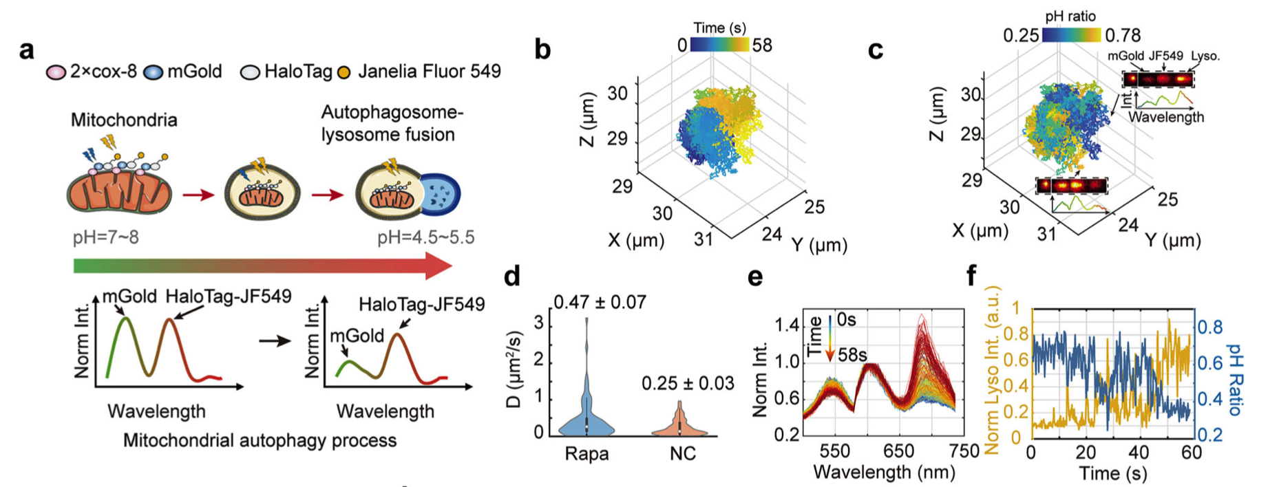 同時,科研人員在使用3D-SpecDIM監(jiān)測線粒體自噬過程時發(fā)現(xiàn),當(dāng)溶酶體逐漸向受損線粒體靠近并發(fā)生融合時,受損線粒體的酸堿值發(fā)生明顯的下降。